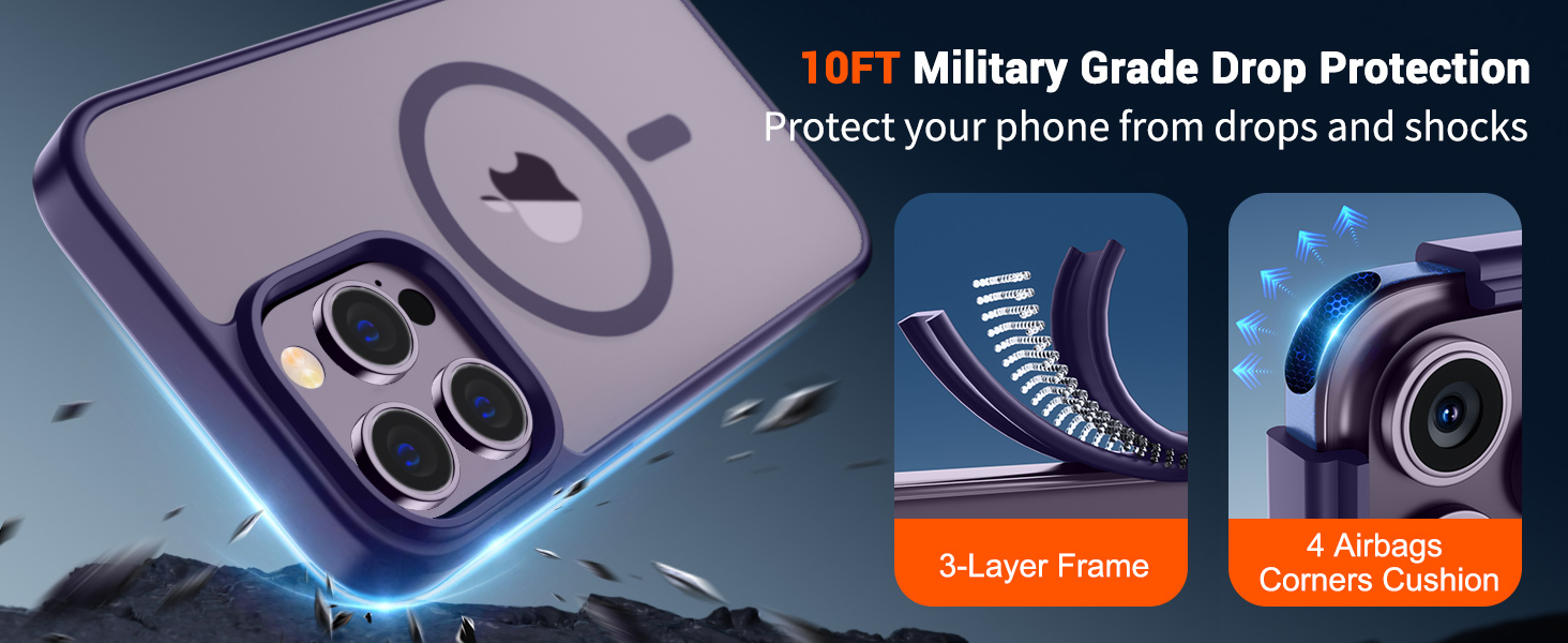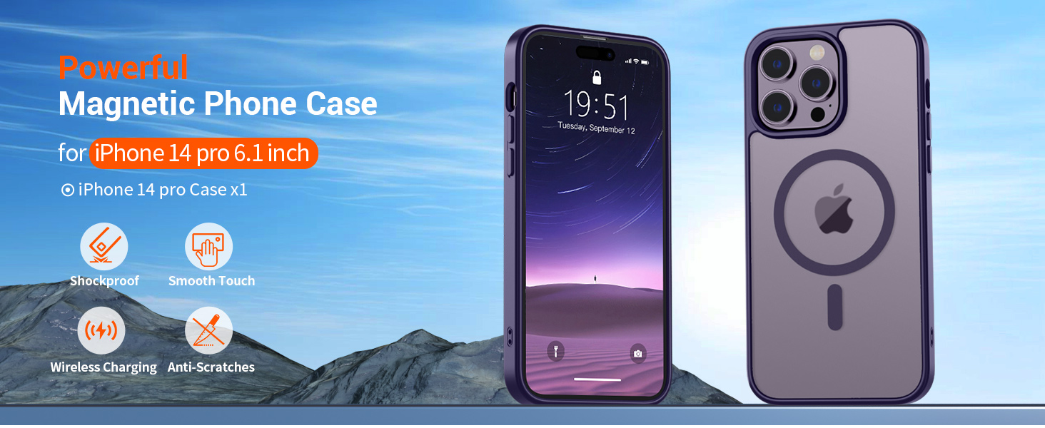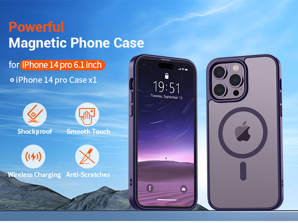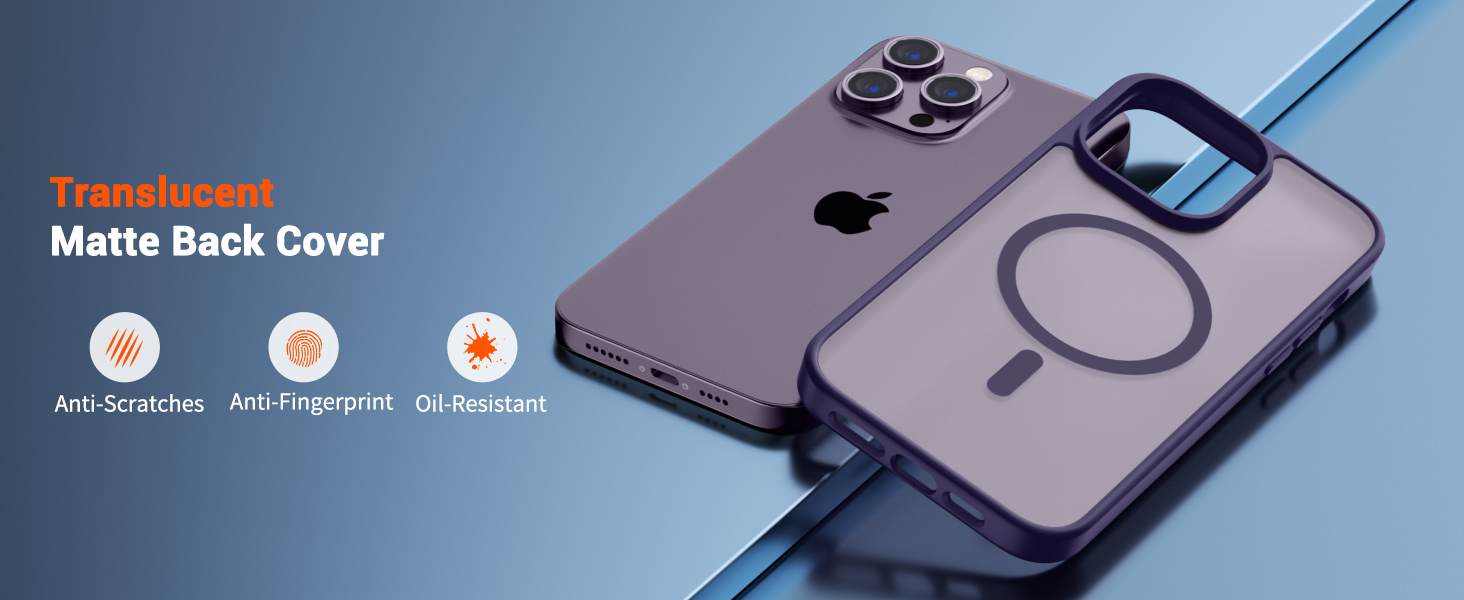 | I14P-PL | 暗紫 | B0D1QY22TQ | SUPFINE Magnetic for iPhone 14 Pro Case (Compatible with MagSafe) (Military Grade Drop Protection) Translucent Matte Shockproof with Anti-Fingerprint Phone Case,Dark Purple | Super Magnetic Attraction: Powerful built-in magnets, easier place-and-go wireless charging and compatible with MagSafe | Compatibility: Only compatible with iPhone 14 Pro; precise cutouts for easy access to all ports, buttons, sensors and cameras, soft and sensitive buttons with good response, are easy to press | Matte Translucent Back: Features a flexible TPU frame and a matte coating on the hard PC back to provide you with a premium touch and excellent grip, while the entire matte back coating perfectly blocks smudges, fingerprints and even scratches | Shock Protection: Passing military drop tests up to 10 feet, your device is effectively protected from violent impacts and drops | Screen and Camera Protection: Raised screen edges and camera lens frame provide enhanced protection where it really counts |