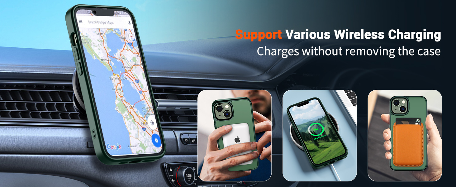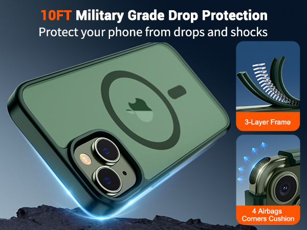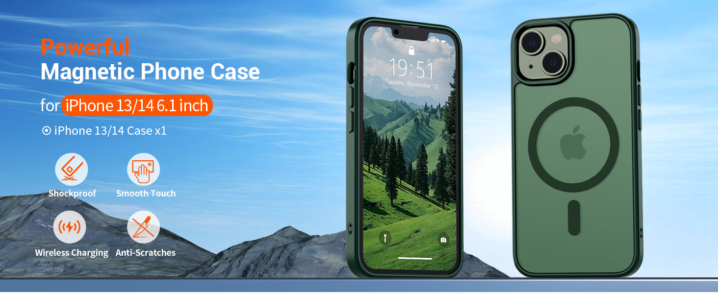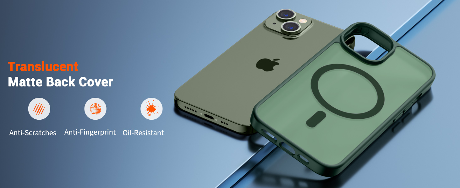 | IP13-DG | 森林绿 | B0DJCWPQMM | SUPFINE Magnetic for iPhone 14 Case & iPhone 13 Case (Compatible with MagSafe) (Military Grade Drop Protection) Translucent Matte Shockproof with Anti-Fingerprint Phone Case,Forest Green | Super Magnetic Attraction: Powerful built-in magnets, easier place-and-go wireless charging and compatible with MagSafe | Compatibility: Only compatible with iPhone 13/14; precise cutouts for easy access to all ports, buttons, sensors and cameras, soft and sensitive buttons with good response, are easy to press | Matte Translucent Back: Features a flexible TPU frame and a matte coating on the hard PC back to provide you with a premium touch and excellent grip, while the entire matte back coating perfectly blocks smudges, fingerprints and even scratches | Shock Protection: Passing military drop tests up to 10 feet, your device is effectively protected from violent impacts and drops | Screen and Camera Protection: Raised screen edges and camera lens frame provide enhanced protection where it really counts |